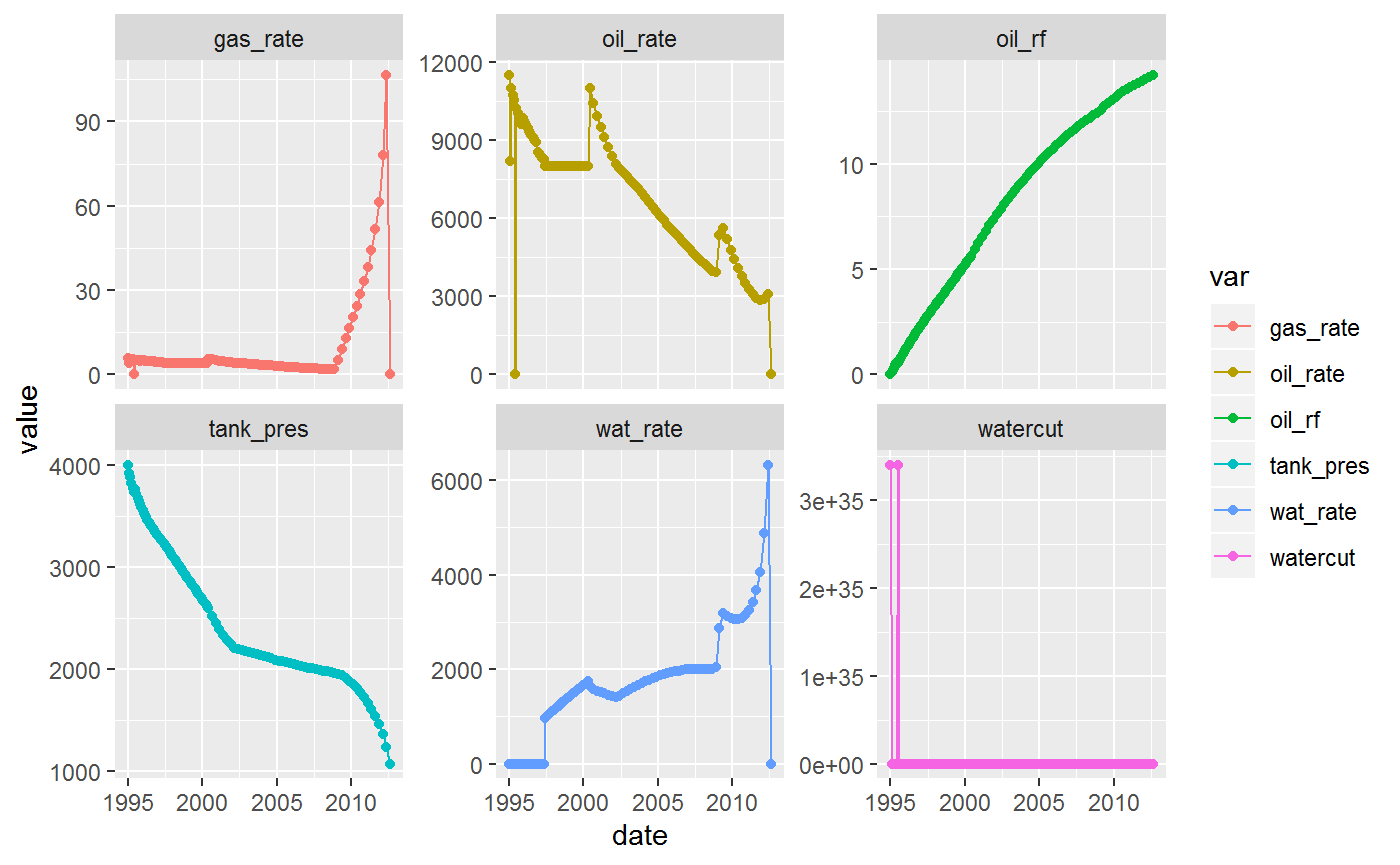 df <- data.frame(date, oil_rf, oil_rate, gas_rate, wat_rate, tank_pres, watercut)